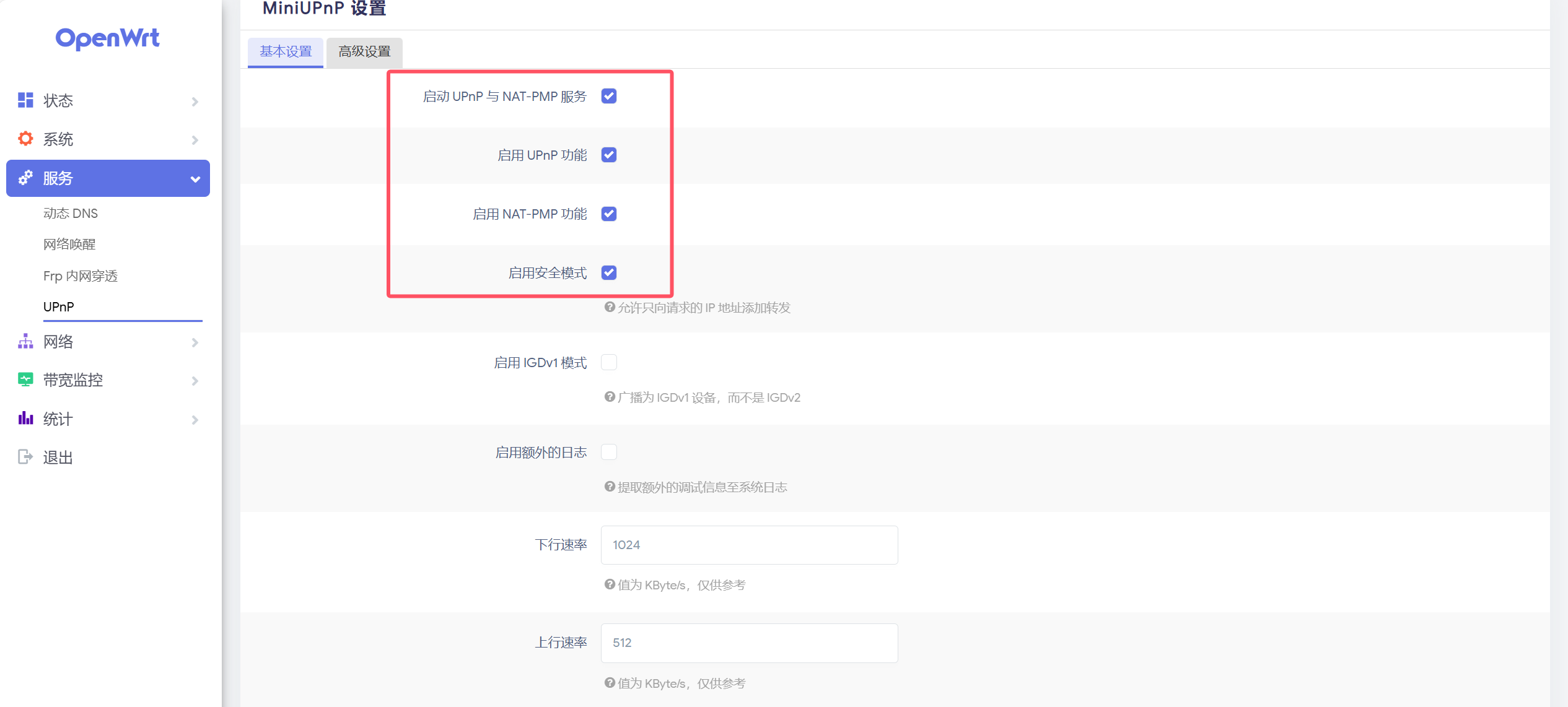 在 OpenWrt 中开启 UPnP 的方法:在服务 - UPnP页面中勾选对应选项。