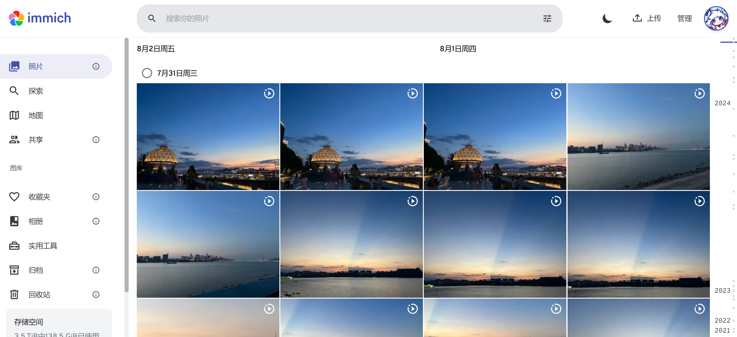 Immich 是一个直接从 iPhone、Android 手机上备份照片与视频的开源解决方案,通过部署在自己的电脑、NAS、服务器中,使用 App 进行备份。界面酷似 Google Photos,支持多用户、照片和相册分享、好友上传、地理位置、机器学习识别事件等功能。是居家备份照片的好帮手。