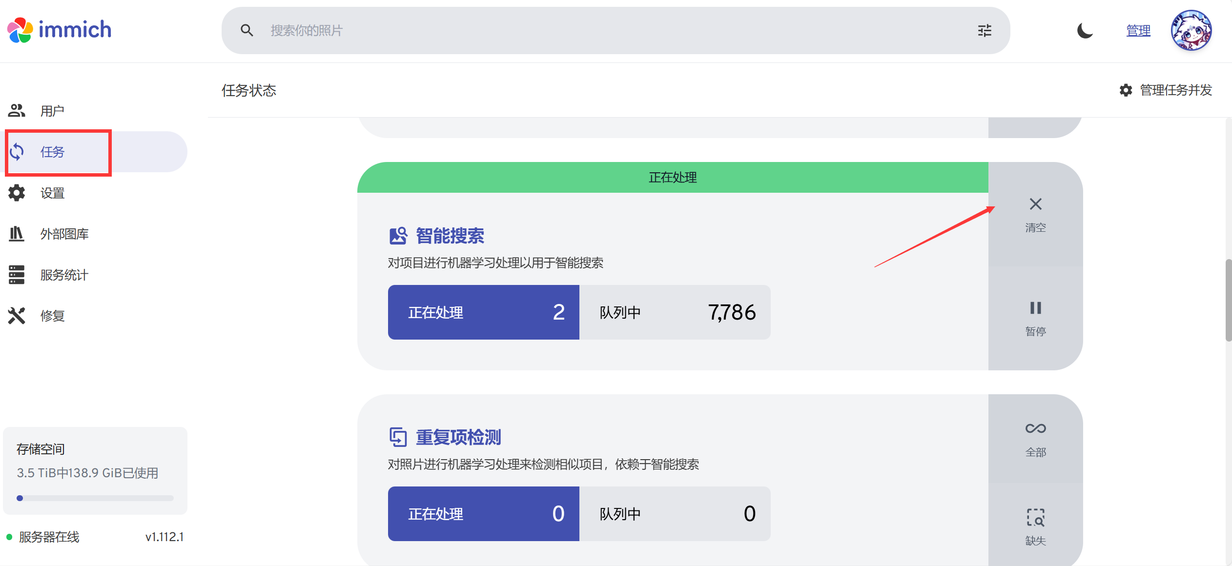 修改完成后,点击左侧任务一栏,找到智能搜索一项,点击全部。Immich 会先下载对应的模型,再对所有的图片进行机器学习处理。