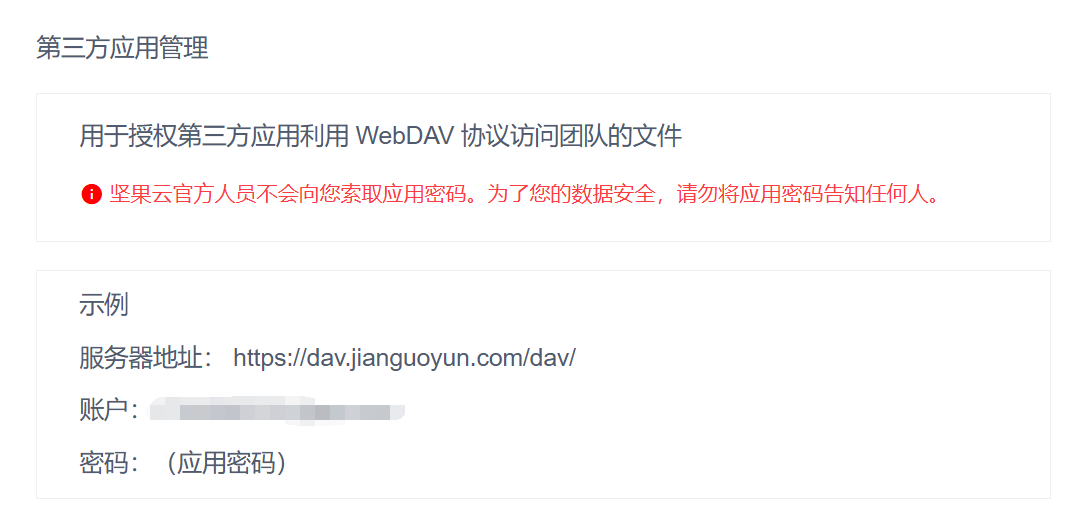 坚果云对于免费用户每月提供 1GB 的上传流量以及 3GB 的下载流量。可以在第三方应用管理处创建应用密码。