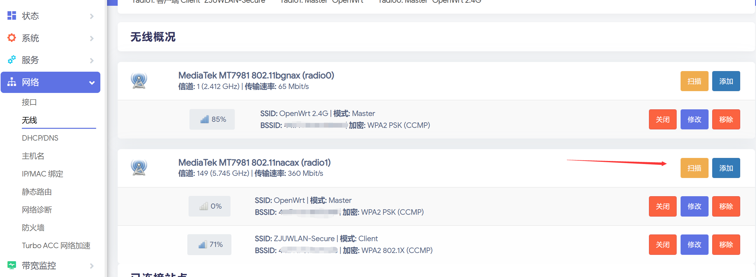 在网络 - 无线 - 无线概况中点击对应频段的扫描按钮,并连接对应无线网络即可。对于路由器连接校内 WiFi,请参照硬路由(3)—— 校园网 & 认证方案对应部分。