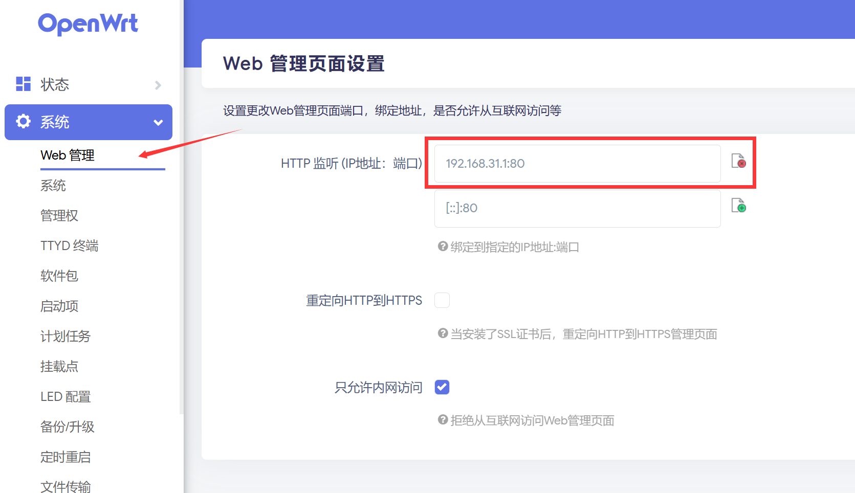 同时在系统 - Web 管理处将 HTTP 监听地址更改为新的 LAN 口地址。
