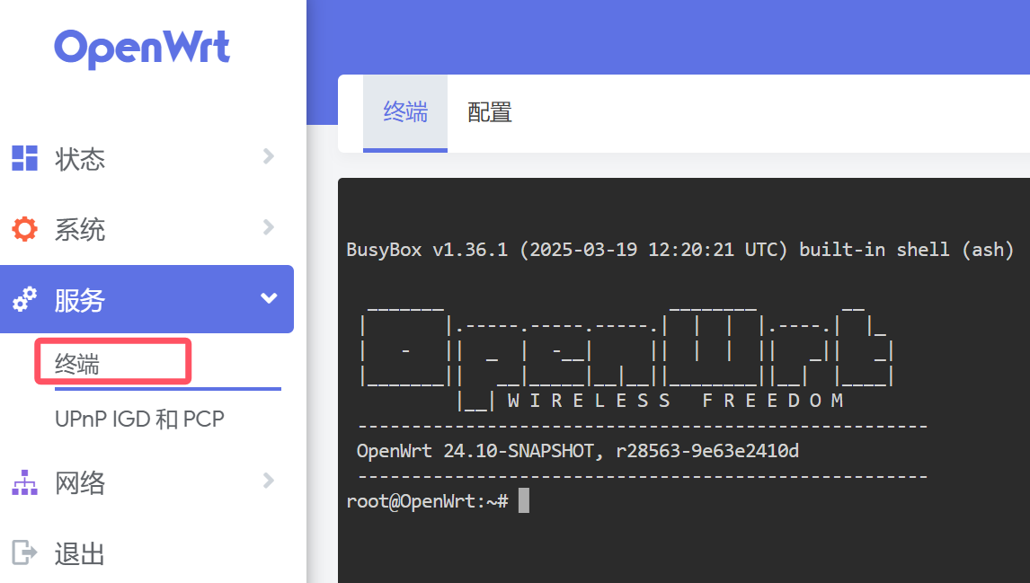 OpenWrt 采用的包管理器为 opkg。在执行后续操作时,请先根据 WAN 接口配置以及下一章节:校园网 & L2TP / 网页认证部分,确保路由器能够访问公网。在服务 - 终端处登录root,输入: