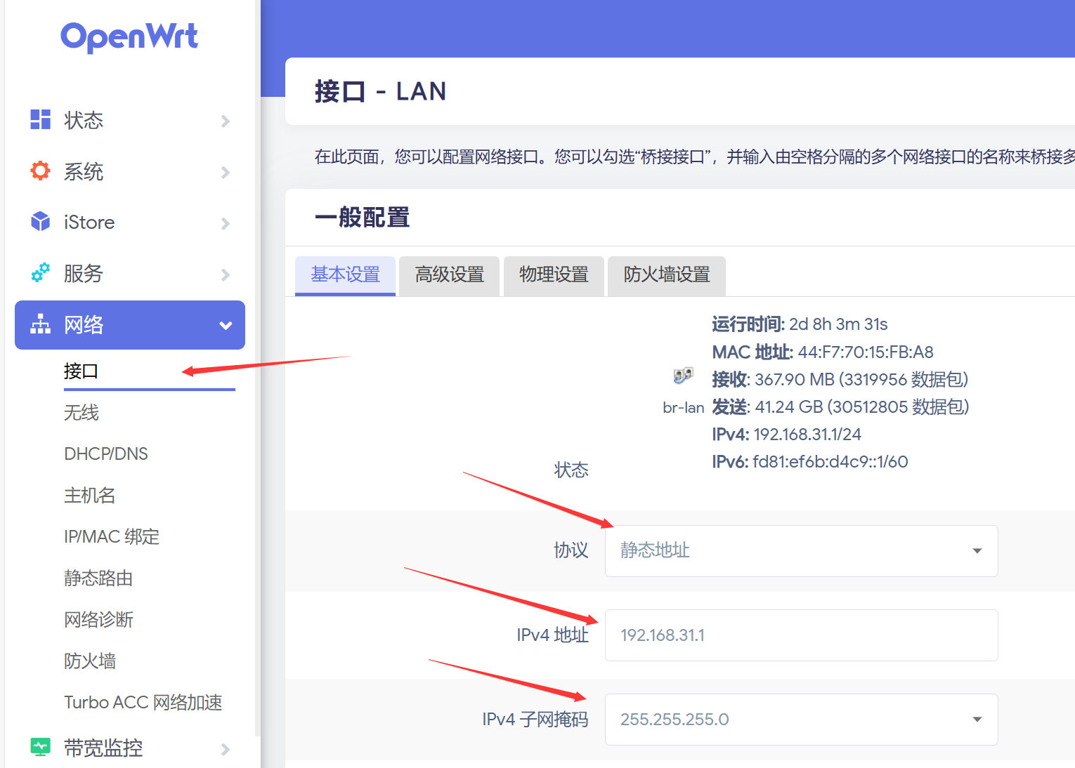 网络 – 接口 - WAN页面中修改为静态 IP,IP 地址是 192.168.3.2,子网掩码 255.255.255.0,网关 192.168.3.1,其它留空即可,保存应用。 -