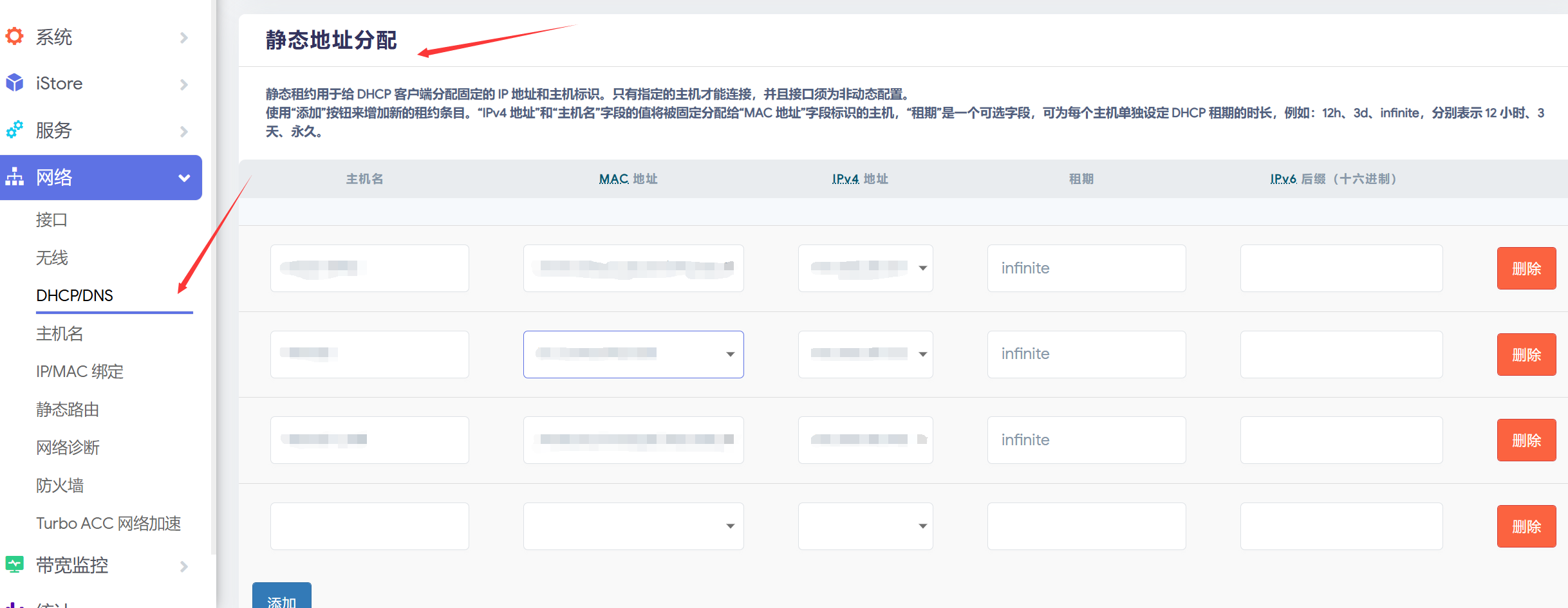 在网络 - DHCP/DNS - 静态地址分配处添加静态租约,填写主机名,MAC 地址,IPv4 地址,租期。