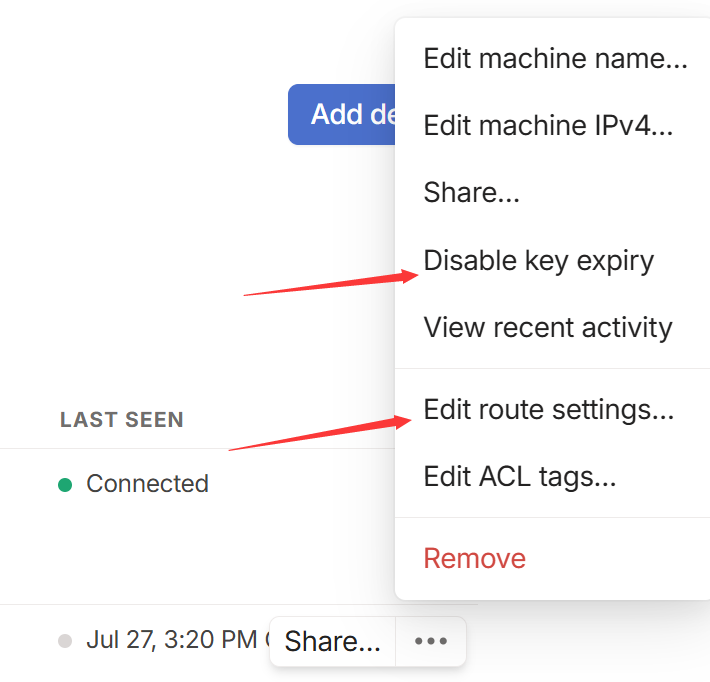 在 Tailscale 的管理页面上,单击设备列表右侧的更多图标,禁用密钥过期,并打开子网路由。