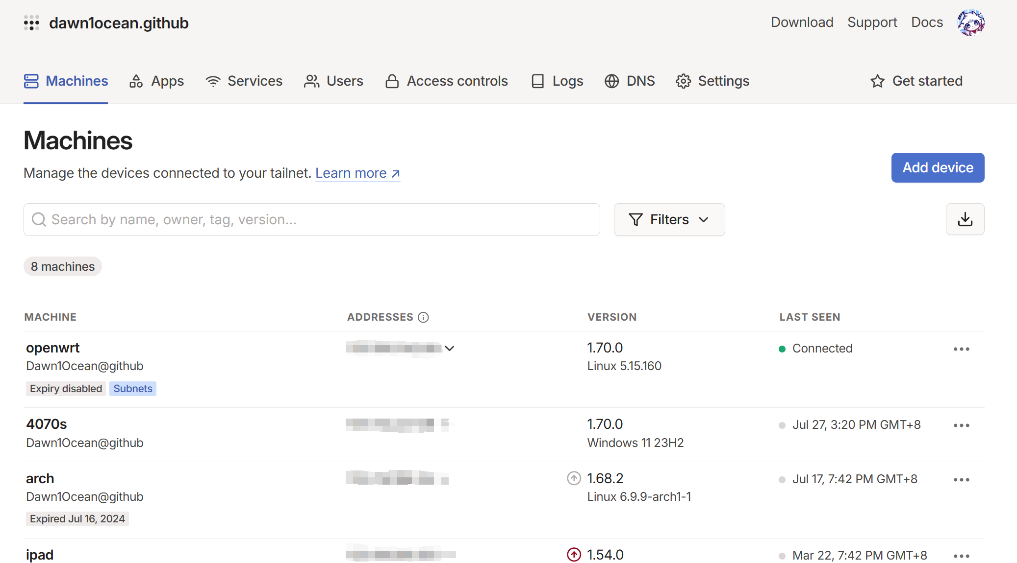 踩坑记录:不要在局域网中其他设备启动 Tailscale 服务,否则可能会使得该设备无法访问路由器。