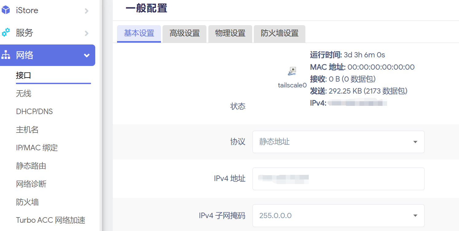 在网络 - 接口处新建一个接口,协议选静态地址,设备选tailscale0,地址为 Taliscale 管理页面上分配的地址,掩码255.0.0.0。防火墙区域选 lan 区域。