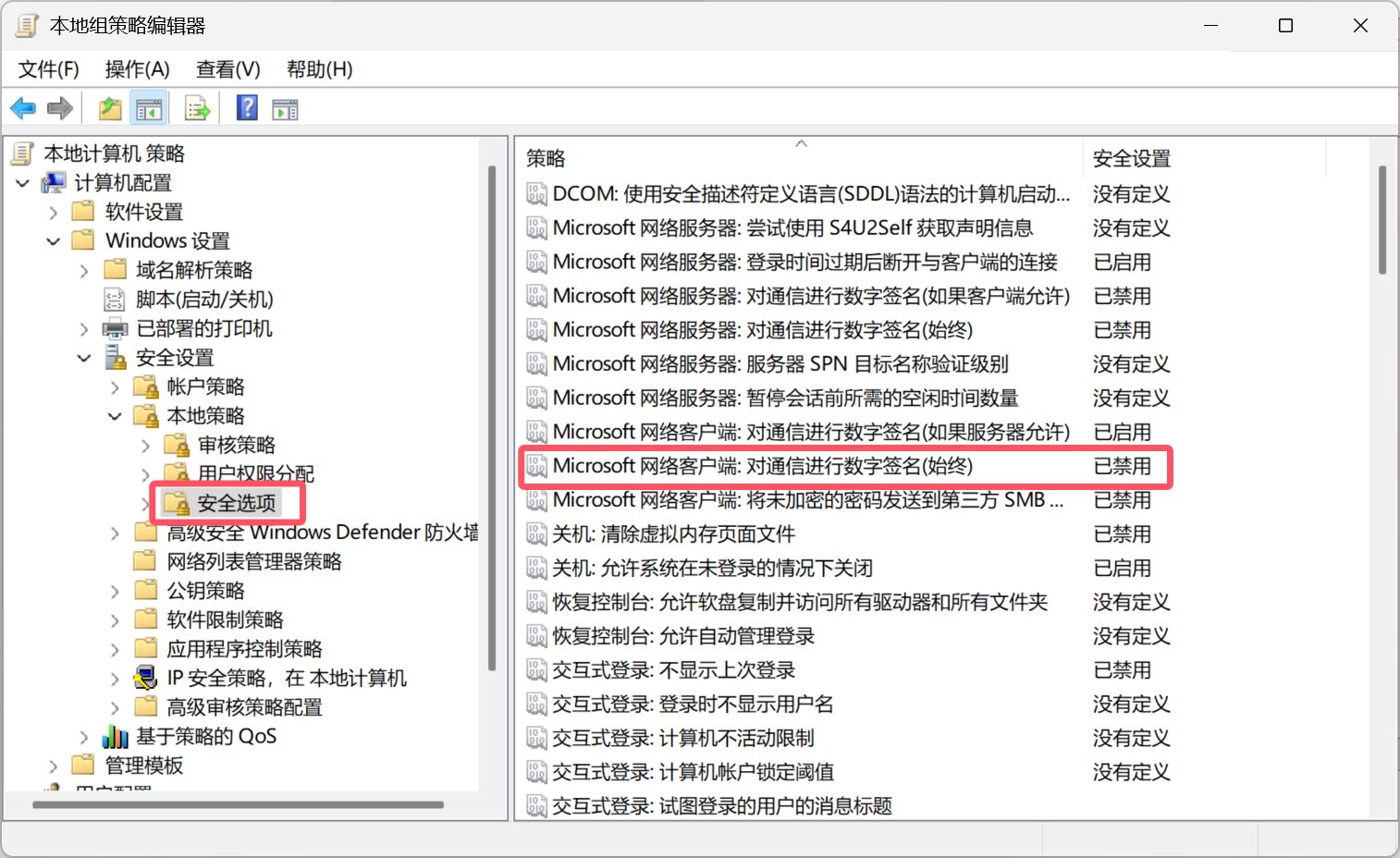 选择计算机配置 > Windows 设置 > 安全设置 > 本地策略 > 安全选项,在右侧窗口中找到Microsoft网络客户端:对通信进行数字签名(始终) 选项。