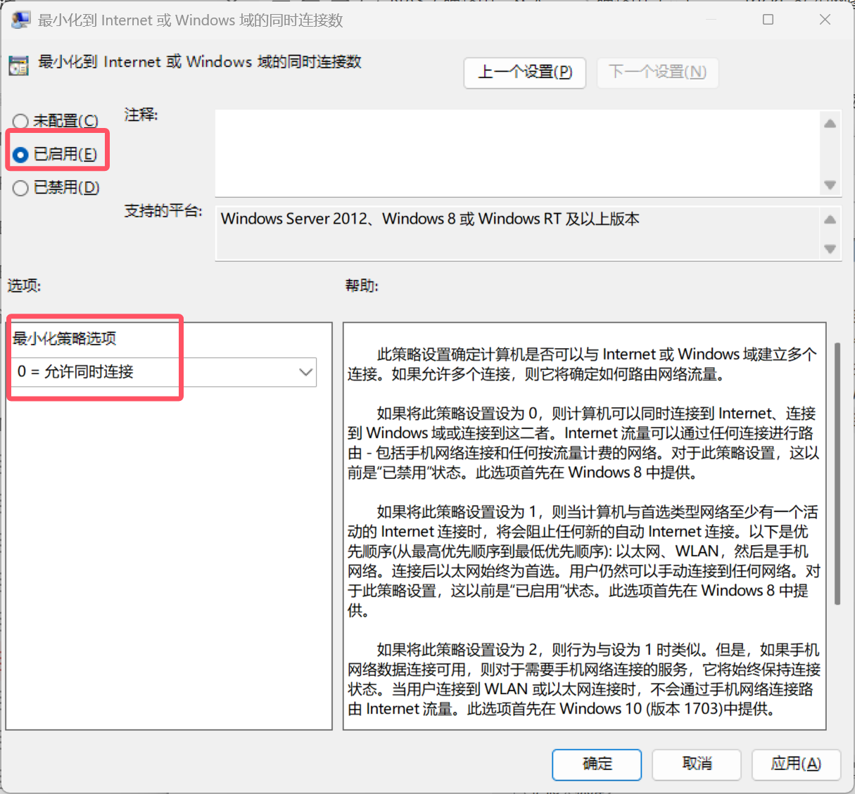勾选“已启用”,最小化策略选择0 = 允许同时连接即可。