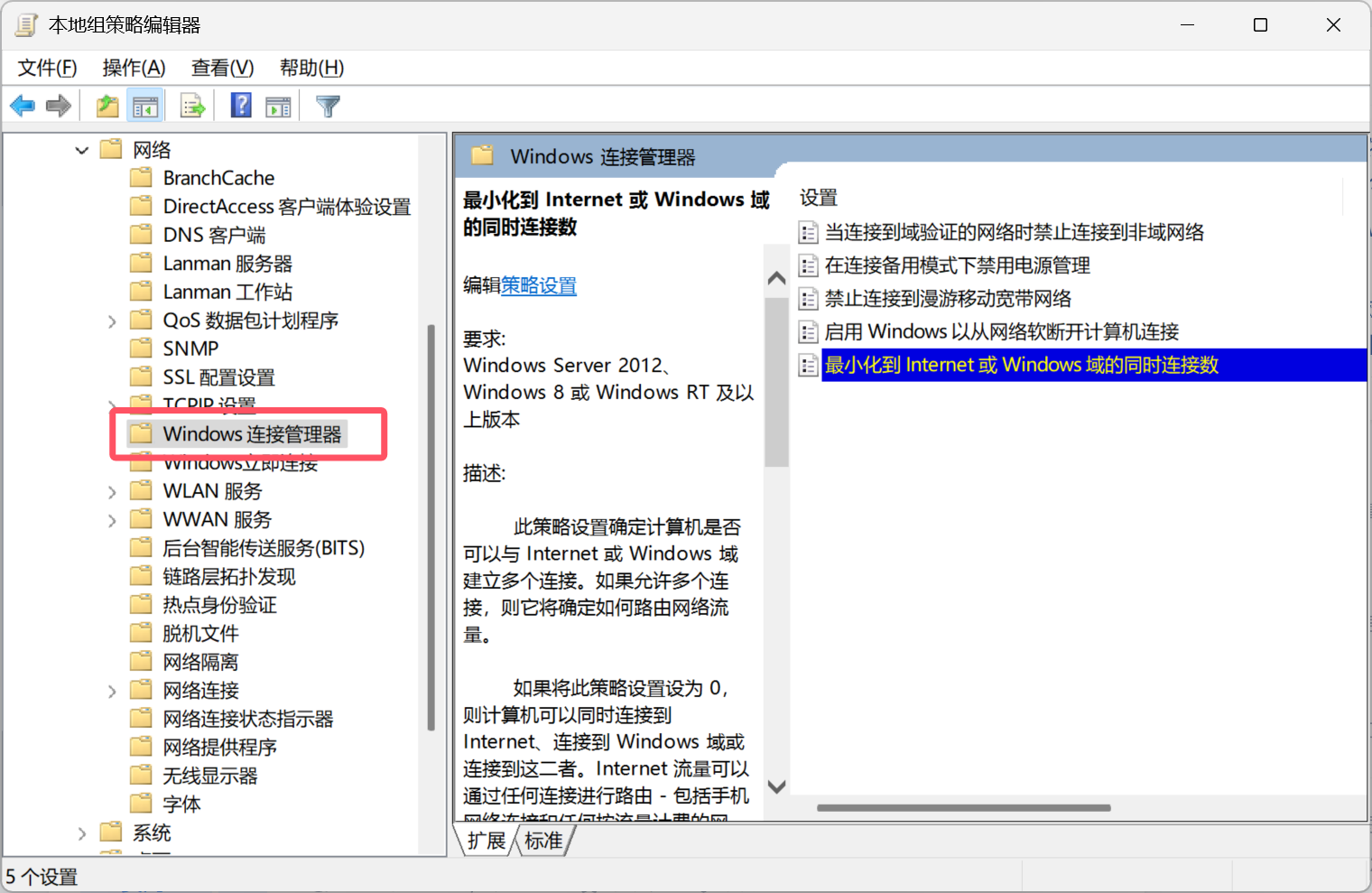 打开计算机配置 > 管理模板 > 网络 > Windows 连接管理器 > 最小化到 Internet 或 Windows 域的同时连接数: