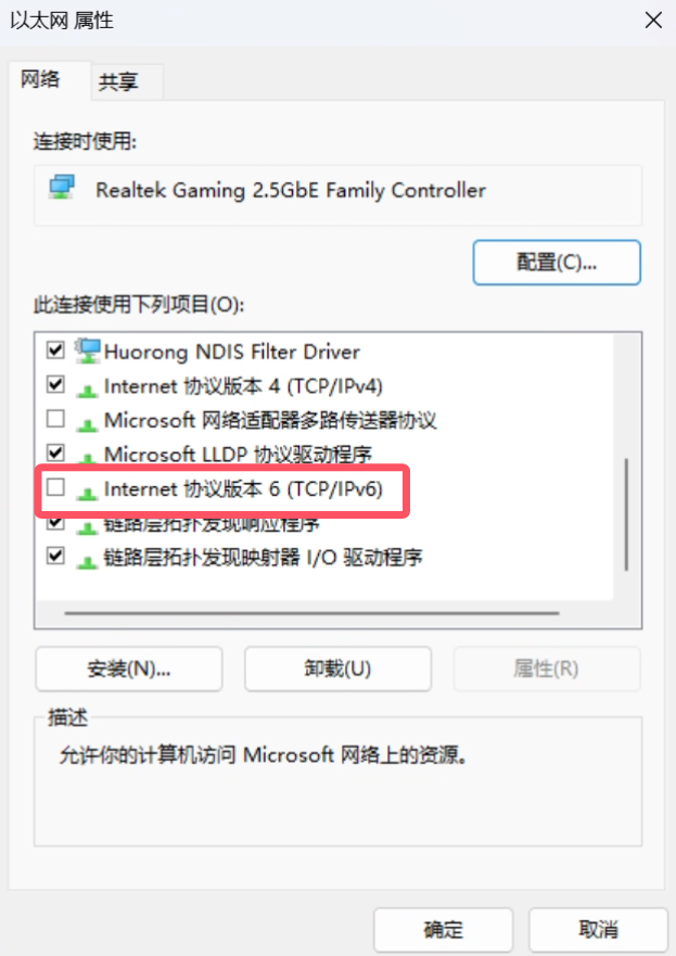 进入控制面板 - 网络和共享中心 - 更改适配器设置,在弹出的窗口中右击以太网 – 属性,取消勾选Internet 协议版本 6 (TCP/IPv6)。至此配置结束。