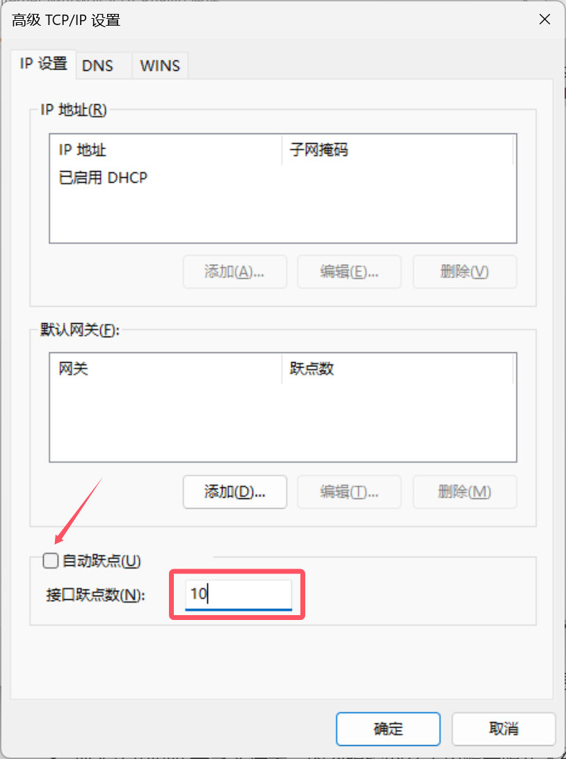 取消勾选“自动跃点”,填入一个较小的数值(建议为 10)。