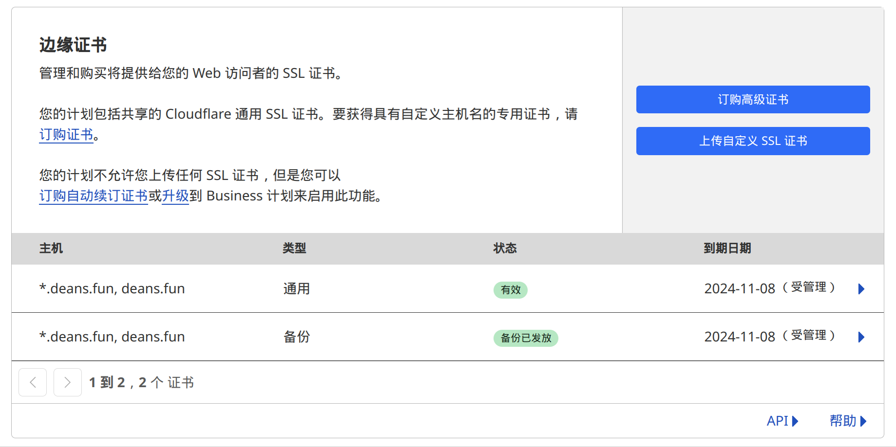 进入SSL/TLS - 边缘证书栏,我们可以看到 Cloudflare 已经为域名申请了证书。如果证书处于等待 TXT 验证状态,等待验证完毕即可成功访问站点。